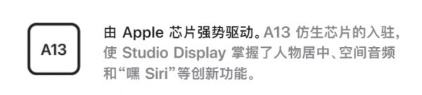而且,我们也注意到苹果正在将高性能的芯片扩展到更多的设备中,就连作为显示器使用的Studio Display,苹果都为其专门配置了一颗A13处理器,这颗A13处理器的工作内容十分简单,负责处理空间音频、人物居中和Siri等功能。
