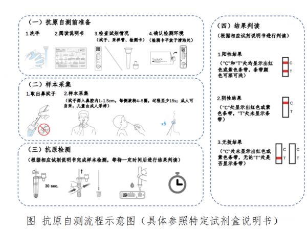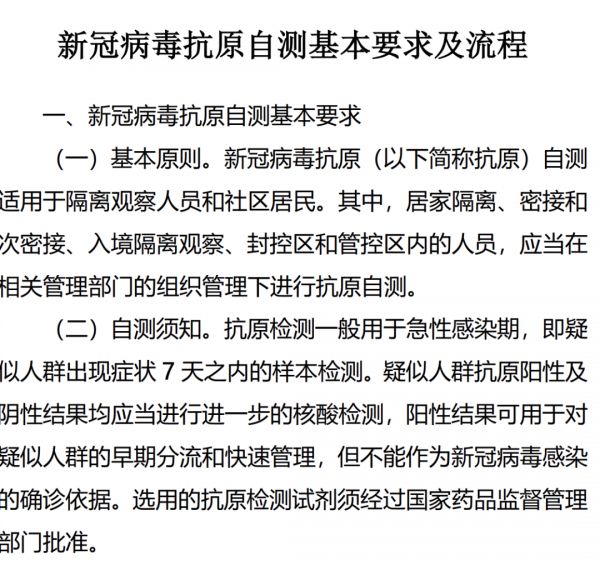 在此次印发方案中,还配套有《新冠病毒抗原自测基本流程及要求》,对个人进行了使用方法上的指导。