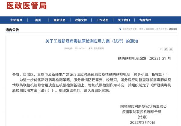 3 月 11 日,国家卫健委印发新冠病毒抗原检测应用方案,决定在核酸检测基础上,将抗原检测作为补充。
