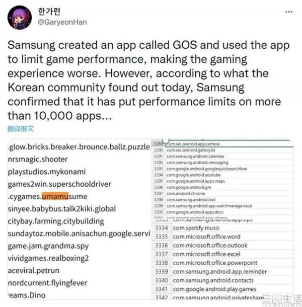 数天后,一份更加详细、多达10000余个应用的“GOS名单”被编制出来。外界惊奇地发现,GOS的作用远不只是限制游戏过程中的发热,事实上几乎在所有常见的应用中,GOS都会限制这些机型的性能输出。其中不只包括各类社交软件、视频软件,甚至就连出厂预装的三星、微软、谷歌的各种自带应用也没有被放过。
