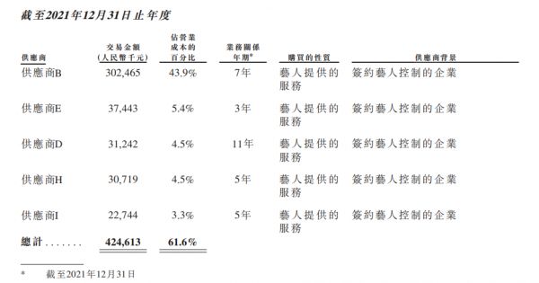 有媒体称乐华娱乐是“王一博概念股”,这更多是从数据层面看到的信息:2021年,乐华的营业成本从2020年的4.29亿增长60.5%至6.89亿。对此,乐华的解释是因为分给艺人的分成更多了(艺人分成于乐华而言是成本,艺人同时也是乐华的内容服务供应商),分成支出从2020年的3.19亿增长至2021年的5.29亿——这其中,根据合作年限及招股书信息推断,供应商B基本可以确定为王一博,而供应商B的交易金额在过去三年从3000万翻到3个亿。换句话说,供应商B是乐华最吸金的艺人、同时也是付出成本最高的艺人。