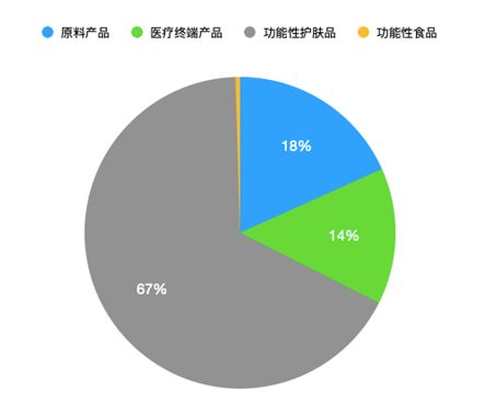 华熙生物有四大业务板块,分别是原料产品、医疗终端产品、功能性护肤品、功能性食品。根据2021年报披露,原料产品收入9.05亿元、医疗终端产品收入7亿元、功能性护肤品收入33.19亿元,功能性食品业务没有直接公布业绩,但可以推算出收入为0.24亿元。