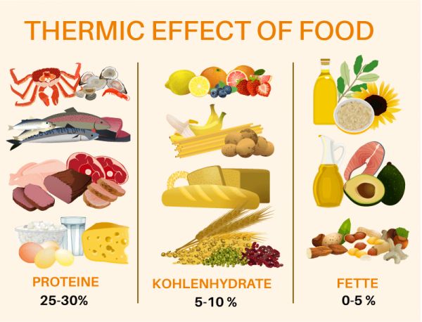 而蛋白质是引起食物反应最大热效应的常量营养素。由于食物的热效应,食用后纯蛋白质中大约 25% 的卡路里会被燃烧掉。另一方面,由于食物的热效应,脂肪和碳水化合物会分别引起大约 5% 的卡路里消耗。提高蛋白质的摄入配比可以一定的提高食物热效应。
