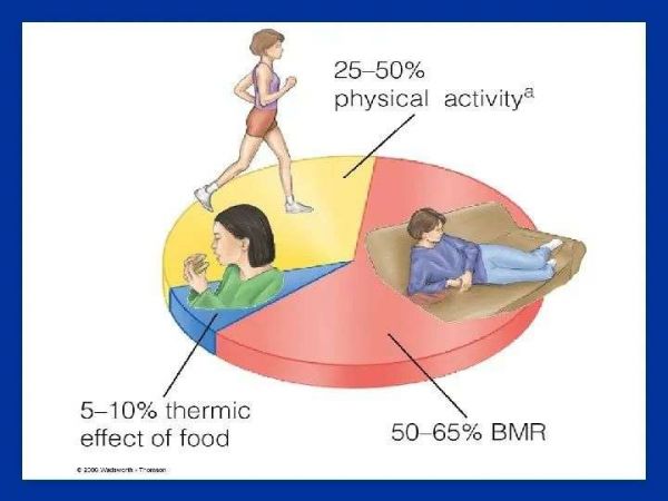 基础代谢代表一个人最大的能量消耗(50-65%),其次是体育锻炼(25-50%)和食物的热效应(5-10%)。