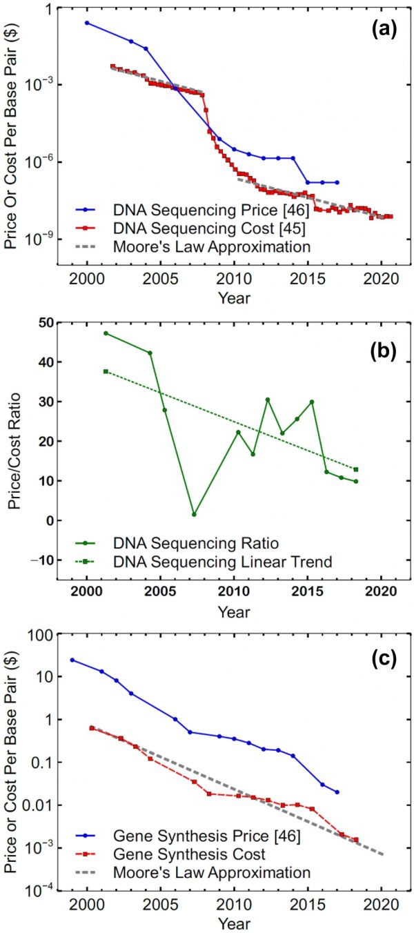但是,通过使用计算机芯片研发规律作为指导,研究人员发现,产生合成生命的速度和成本,可能会随着时间的推移遵循与电子产品的性能和成本类似的轨迹。