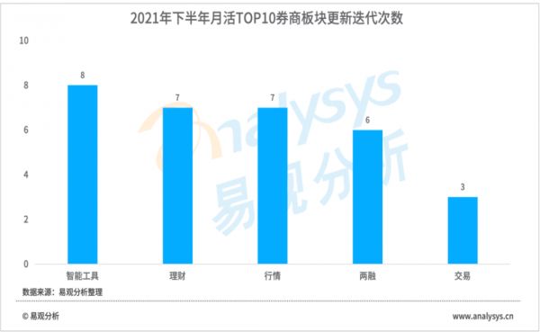 激烈的用户竞争格局促使各证券APP加大版本迭代力度。在此背景下,智能工具和理财板块成为2021年券商自营TOP10APP版本的主要迭代方向。