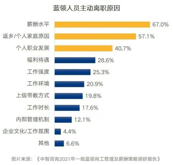 《中智咨询2021年一线蓝领用工管理及薪酬策略调研报告》报告也指出,一线蓝领主要离职原因排在前三的分别为薪酬水平、返乡/个人家庭原因和个人职业发展,其中薪酬水平为首要影响因素,占比为67%。