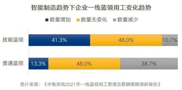未来有着强经验、强技术曲线的,并伴随时间增长有更高的薪酬与职业竞争力的制造业企业,对年轻人的吸引力会愈加明显。从中智咨询2021年的调研报告来看,智能制造对技能蓝领的用工需求也在大幅增长。