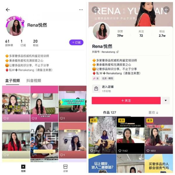 比如下面这个账号Renna悦然在抖音上的粉丝是2.7万,在抖音盒子上的粉丝就是20个。