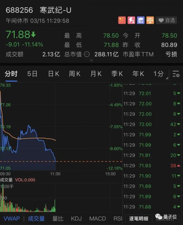 截至发稿,寒武纪股价报71.88元,跌幅达11.14%,市值蒸发约36亿人民币。