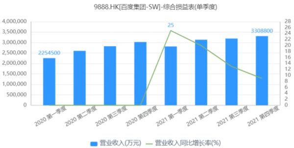 从表层的财务数据来看,2021年第四季度,百度实现营收330.9亿元,同比增长9%;实现净利润17亿元,同比下滑67%;非美国通用会计准则下归属百度的净利润为41亿元,同比下降41%。