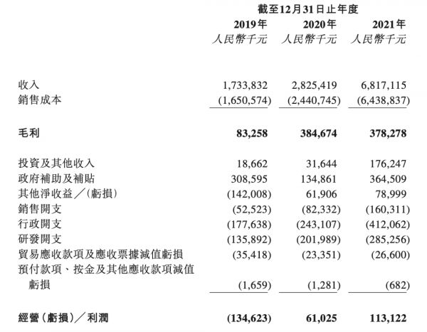 先从营收看起。招股书显示,2019年—2021年,中创新航营收由17.33亿元、28.25亿元飙升至了68.17亿元,复合年增长率高达98.3%。此外公司的净利润由-1.56亿元转为1.12亿元,成功实现扭亏为盈。