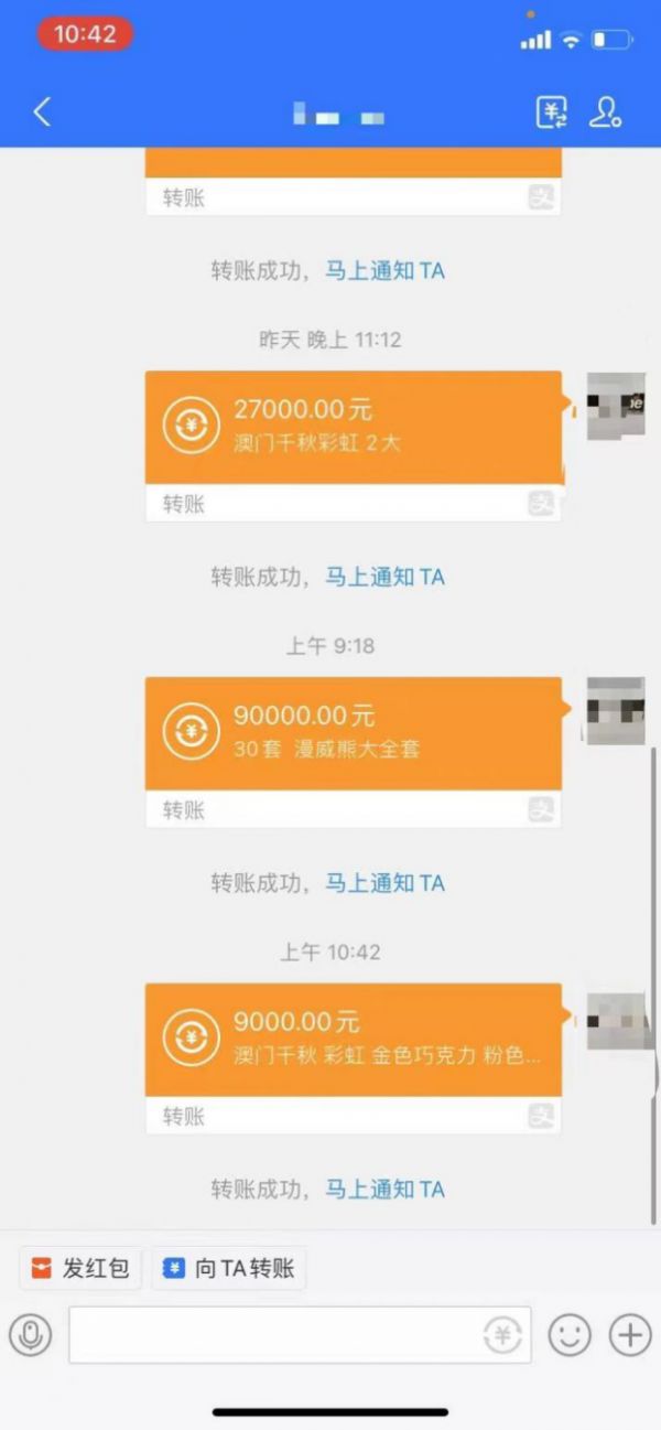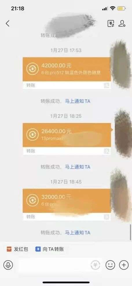 我跟她稳定合作了一段时间,拿过10多只包,每次去取货时,小票显示的都是正价。今年1月,她跟我说,她那边有一批iPhone13 Pro Max 512GB版本,最低能给到7000元,我和朋友就拿了10台试了试,也都拿到货了。过了几天她又告诉我,过年前又有五六十台的名额,我就找了几个朋友一起付了货款。有些是直接转账给她,有些是转给了她提供的商家二维码。
