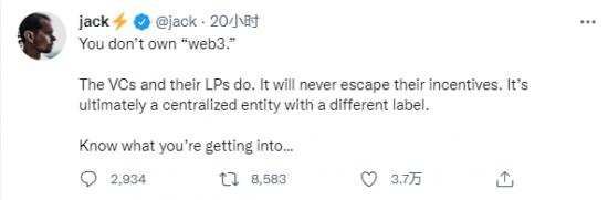这也是Twitter前首席执行官多尔西抨击Web3.0的主要原因,他指出“用户并不实际拥有Web3产品,Web3的实际拥有者是项目背后的风投机构(VC)及其有限合伙人(LP),Web3永远不能脱离他们设定的激励机制。最终,Web3将是一个带有不同标签的中心化实体”。
