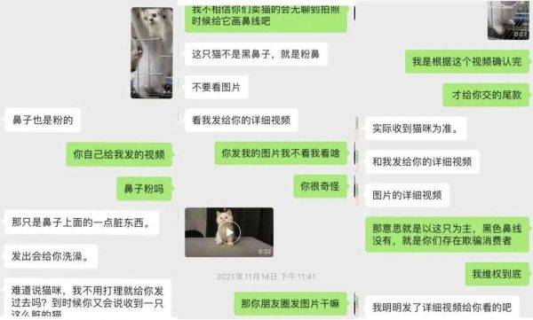 但当小猫收到的时候,发现没有鼻线,眼睛是黄色的,卖家给出的理由简直滑天下之大稽:一会说洗澡洗掉了,一会说以视频为主,一会又说以实际收到为主,搞笑得很。