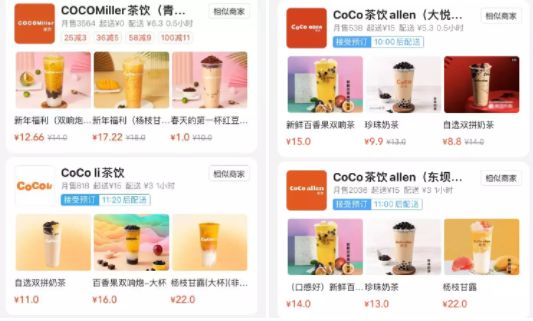 既然是山寨,首先在品牌的宣传页面上肯定得和原品牌具有一定相似度,以我家附近为例,在美团上搜索CoCo,至少会弹出4家近似的品牌,页面上LOGO的配色都是以橙色和白色为主要配色,这和CoCo都可品牌的经典配色基本一致,除此之外,在名称上也多是以CoCo开头,因此极其容易让人混淆。