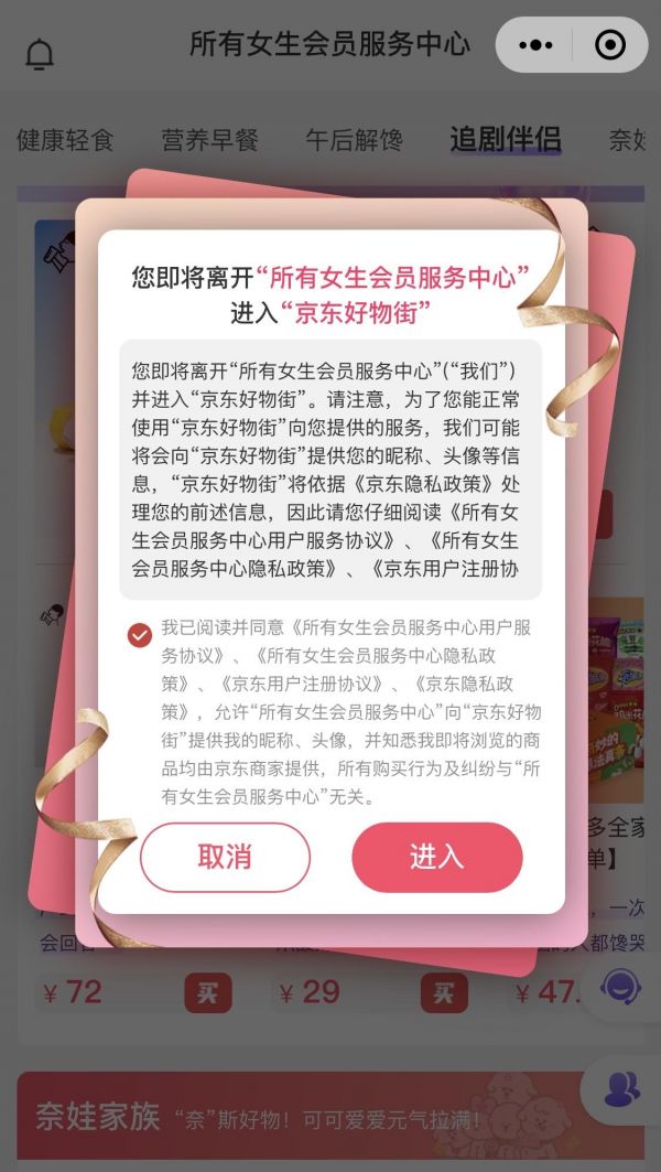 根据系统的授权提示,所有女生会员服务中心的售卖产品来自京东好物街。这意味着,李佳琦的业务团队,正在从腾讯和京东,寻找流量和业务增量。