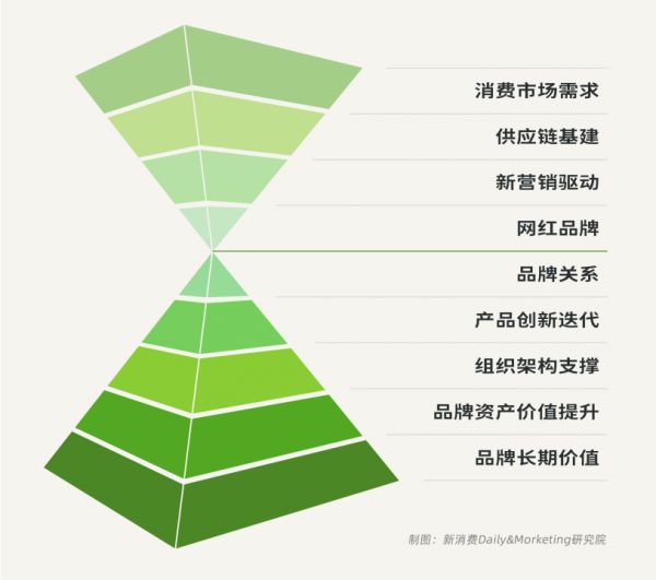 为此,「新消费Daily」联合「Morketing研究院」搭建了以新消费品牌建设思路为核心轴的漏斗模型,以探讨在内生、外生力量下新消费品牌的增长驱动因素。