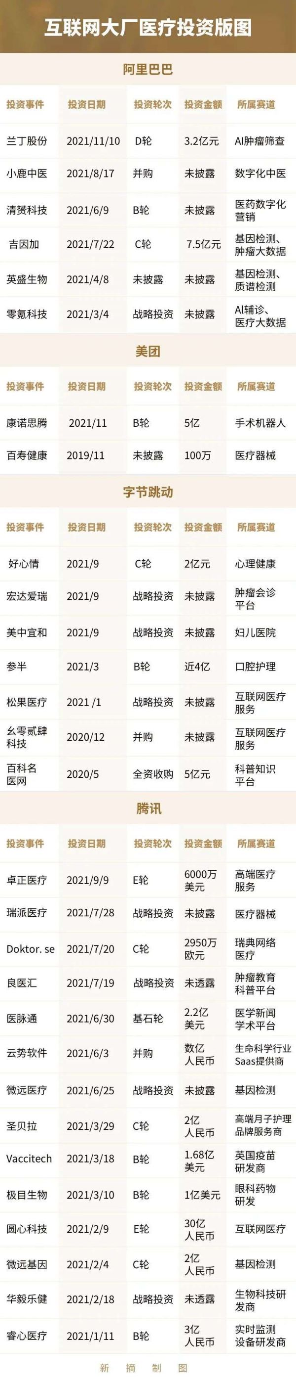 2020年5月,为了填充字节百科产品的医疗内容,字节收购了百科名医,同年11月推出了医疗健康品牌“小荷”以及“松果门诊”线下诊疗机构,紧接着12月,成立专门负责大健康业务的极光部门,收购幺零贰四科技这家医疗公司,2021年9月字节领头了互联网医疗平台“好心情”2亿元的C轮融资。