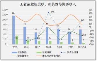 财报数据显示,腾讯在2021Q3,本土市场游戏收入为人民币336亿元,同比增长5%。国际市场游戏收入为人民币113 亿元,同比增长20%,腾讯在2021年一月发布《王者荣耀》版本更新后,靠着8款皮肤入账40多亿元。