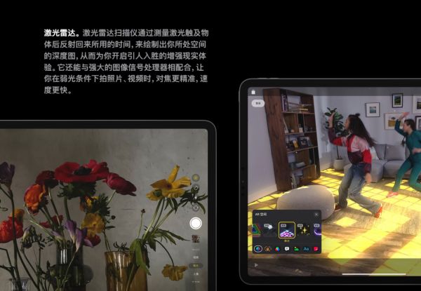 这个装成摄像头样子的传感器其实是应用于AR领域的。这意味着在AR领域,iPad Pro的应用范围会进一步扩大。根据苹果官方的解释,激光雷达 (LiDAR 光探测和测距) ,是通过测量光触及物体并反射回来所需的时间(直接飞行时间 dToF),来确定距离,最远可以测量5米的距离。