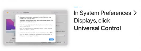 这个功能使用起来非常简单。首先,需要用同一个iCloud账户登入两个以上产品。此外,这些产品需要放在一起使用。最后,只需要稍微设置一下就可以了。例如苹果电脑的设置流程就是: 进入系统偏好设置-选择显示器-点击点击打开通用控制功能即可。