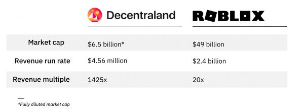 Decentraland与Roblox的指标对比
