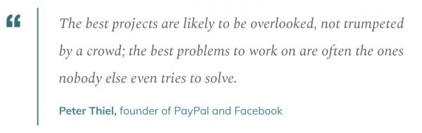 最好的项目可能是人们忽视的项目,或没有大肆宣扬的项目;最好的问题是无人尝试解决的问题。——彼得·泰尔