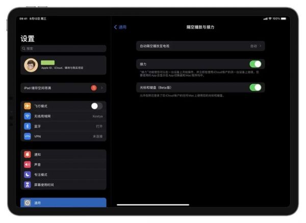 系统更新至上述版本后,iPad 即可在 设置 - 通用 - 隔空播放与接力 中找到「光标和键盘(Beta 版)」的开关。打开它,就完成了在 iPad 上设置 Universal Control 的步骤。