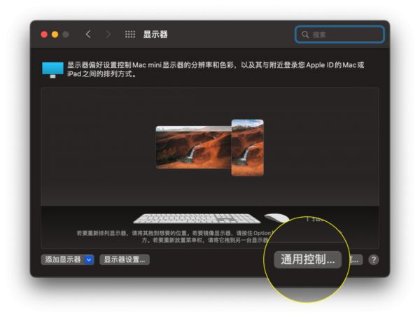在 Mac 电脑上还可以找到一些与 Universal Control 有关的高级设置,包括「移到屏幕边缘自动连接」,以及「自动重新连接已知的 Mac 和 iPad」。这些设置可以在「显示器偏好设置」的右下角「通用控制…」按钮中找到。