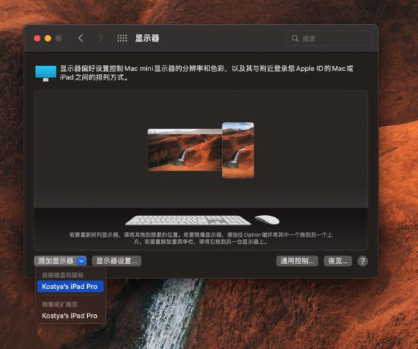 在 Mac 电脑上,打开 系统偏好设置 - 显示器 ,点击「添加显示器」旁边的小箭头,然后选择「用作鼠标和键盘」下的你的 iPad 名称,即可设置完毕。此时,iPad 应当已经与 Mac 建立连接,并且显示在显示器的面板中。如果 iPad 的位置并未自动进行调整,我们可以通过拖动 iPad 屏幕的方式手动重新排列。