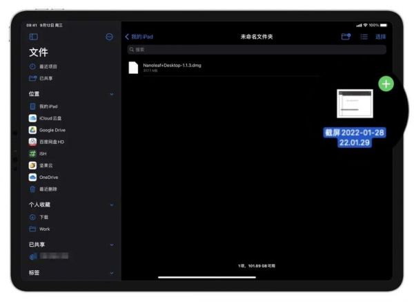 将 Mac 上的文件拖入 iPad 「文件」app 时的效果