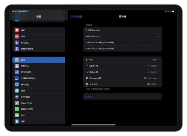 在设置的过程中无意发现:在 Universal Control 连接建立的情况下, iPad 设置 - 通用 - 键盘 - 实体键盘 - 修饰键 中,我们可以看到目前连接到 iPad 的键盘包括了以 V 开头的 Mac 上的键盘;Mac 上的「系统偏好设置」中亦然。