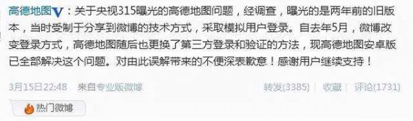 问题曝光后,高德彼时立即做出了解释,称央视曝光的是两年前的旧版本,当时受制于分享到微博的技术方式,采取了模拟用户登录方式。自2012年5月以来,微博改变了登录方式,高德地图后来也改变了第三方登录和认证方式,现高德地图安卓版已全部解决这个问题。