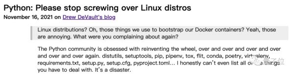 Python社区一次一次又一次地重复造轮子,distutils、setuptools、pip、pipenv、tox、flit、conda、poetry、virtualenv、requirements.txt、setup.py、setup.cfg、pyproject.toml……需要处理的麻烦事儿简直列不完。