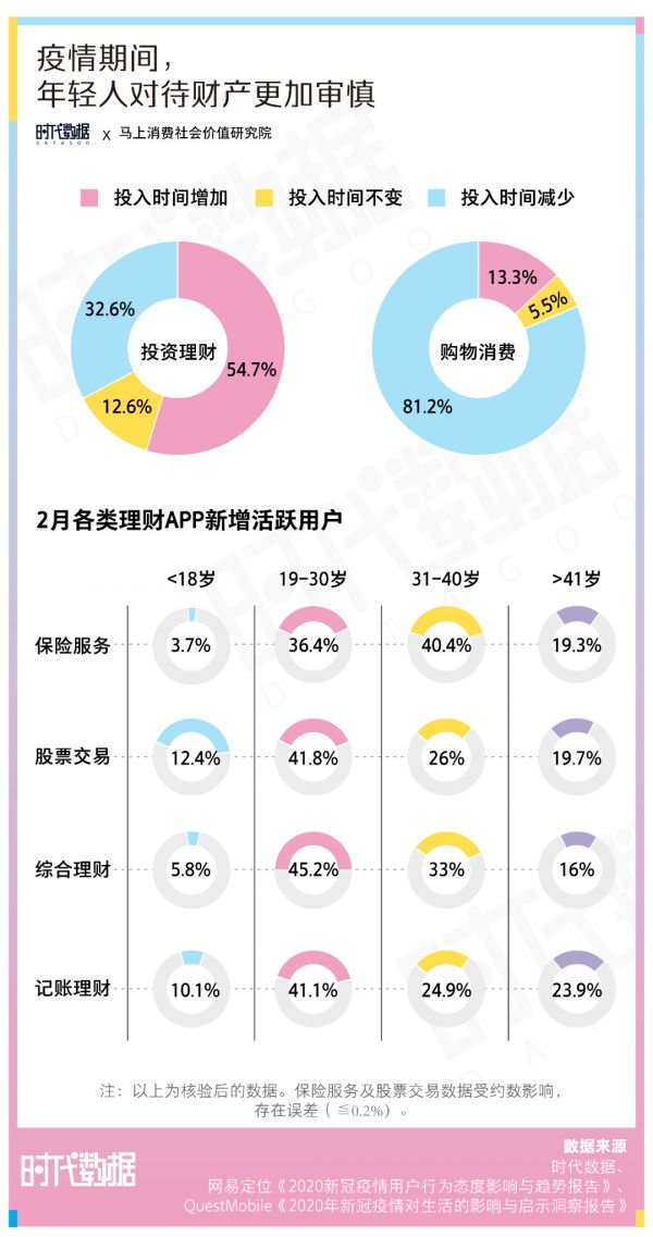 数据显示,疫情期间54.7%的人投入了大量时间、精力来研究各种理财产品。2020年2月以来,除了保险服务APP的活跃度不及31-40岁群体,在股票交易、综合理财和理财记账类APP中,19-30岁用户成为了最活跃的群体。