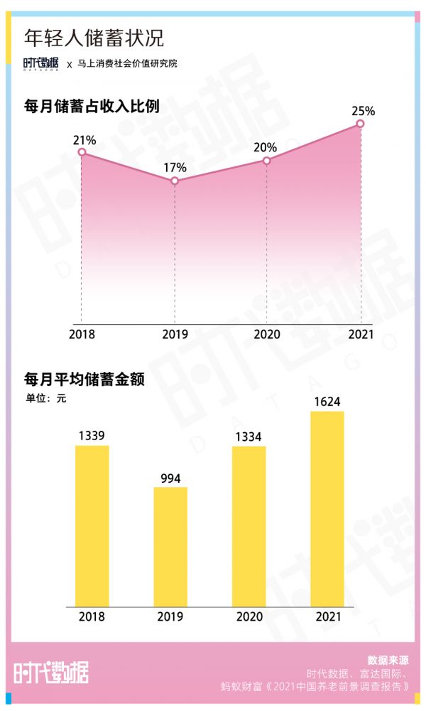 《2021中国养老前景调查报告》显示年轻人储蓄的比例一年比一年高。2021年年轻人每月储蓄占收入比例为25%,每月平均储蓄金额为1624元。这两个数字都已经是近年最高。