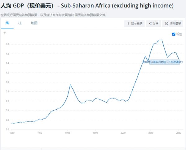世界银行数据,2020年撒哈拉以南非洲地区(不包括高收入)的人均GDP只有1498.6美元,而中国人均GDP为1.05万美元。