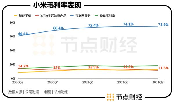体现到业绩上,小米的互联网服务业务小米三大业务中毛利最高的,近三个季均在70%以上,同期收入规模在70亿元左右。而对身为第一大业务的智能手机业务来说,10%左右的毛利率就已经算是高水平了。