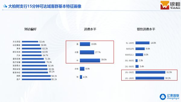 通过亿景智联、银翱咨询联合大数据与实地调研,以两家银行为中心,有效辐射范围内(步行15分钟区域)可以看出,周边的同业竞争大部分都处在边缘区域(见图二),且观察区域11月份的客流也没有显著性区别(见图一),通过客群画像也可以看出(见图三),该区域呈现出显著的生活区特点,整体消费水平和餐饮消费水平适中,在上海地区处于平均值附近,数据结果显示我们选择区域具有一定的代表性。