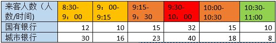 业务需求背景:12.15日,养老金发放日,老年顾客会到银行打印存折业务,也存在部分现金存取业务,属于可预测的特定日高峰期,老年顾客从8:30开始已经开始在银行排队, 9:00银开门,9:30-9:45客流出现极端高峰, 11:00国有银行高峰结束,12:30城市银行高峰业务结束(如图四所示)。
