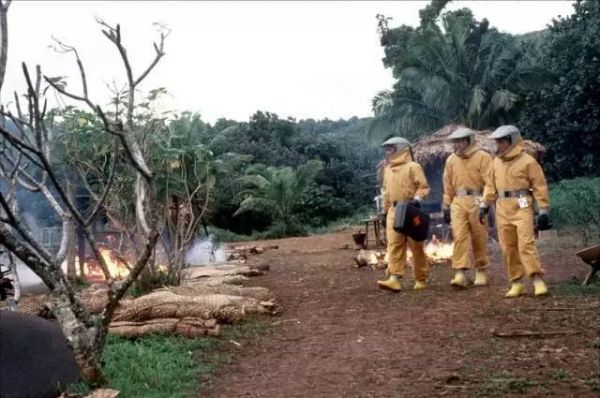 作为通过体液传播的人畜共通病毒,埃博拉被列为生物危害第四级的病毒,即一种对于人与动物危害最高的,尚未发现任何有效疫苗和治疗方法的病毒。通常这样的病毒只能在合乎第四级标准的实验室里进行研究,所以我们可以看到,在最近的《血疫》和1995年的《极度恐慌》中,工作人员都穿着完整且独立供气的隔离衣。据说在1992年,日本的奥姆真理教领袖麻原彰晃曾希望获得埃博拉作为大屠杀工具,但最后并未成功。