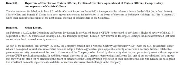 2022年2月18日,CFIUS正式结束对图森未来的长期调查,图森未来付出的代价是其与美国政府达成一项国家安全协议(NSA)。