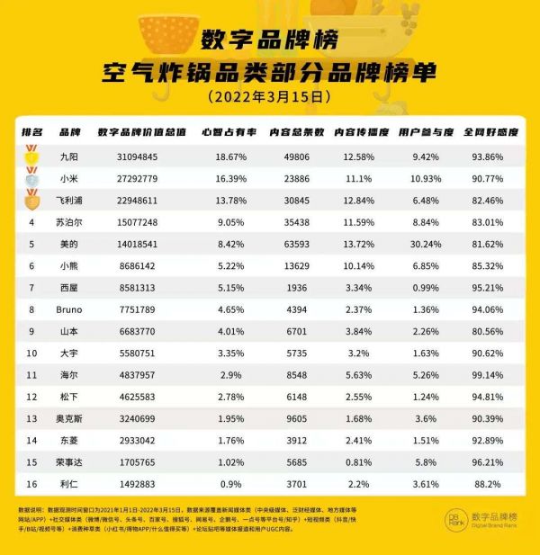 从『数字品牌榜』—空气炸锅品类品牌榜单中我们可以看出,在一众空气炸锅品牌中,九阳空气炸锅以31,094,845DB的数字品牌价值总值位居榜首,行业心智占有率最高。其次,受消费者偏爱的空气炸锅品牌还有小米、飞利浦、苏泊尔、美的等一线大牌,分别以27,292,779DB、22,948,611DB、15,077,248DB、14,018,541DB的数字品牌价值总值位居第2—5名。值得一提的是,美的空气炸锅无论是内容总条数、传播度还是用户参与度,都稳居行业第一,远超其余品牌,却因为好感度偏低,使其数字品牌价值总值大打折扣。