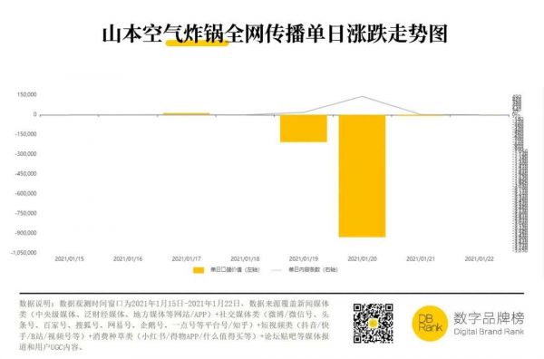 真的香吗?与低价格相对应的,是低质量。当空气炸锅拿到手,消费者才发现,直播间里被夸得天花乱坠的空气炸锅没用几天就出了问题。比如,2021年1月李佳琦直播间带货的一款型号为S-2021TS的山本空气炸锅,很多消费者反映没用几次就出现机器面板显示“EO1”的机器故障。这次翻车事件,给山本空气炸锅带来了极大的负面影响,从『数字品牌榜』的数据观测中可以看出,1月19日、1月20日两天,山本的数字品牌价值出现较大负值。价格不低的山本尚且如此,更便宜的杂牌军们更不消说。