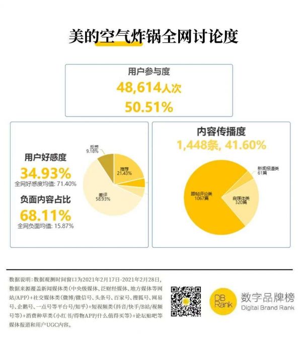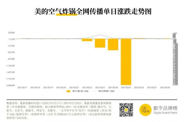根据『数字品牌榜』2月17日——2月28日之间的数据观测,被香港消委会点名后,经过社交媒体的发酵,美的空气炸锅的DB值(数字品牌价值)暴跌,互联网负面内容占比高达68.11%,给美的的品牌美誉度带来了极大的损失。