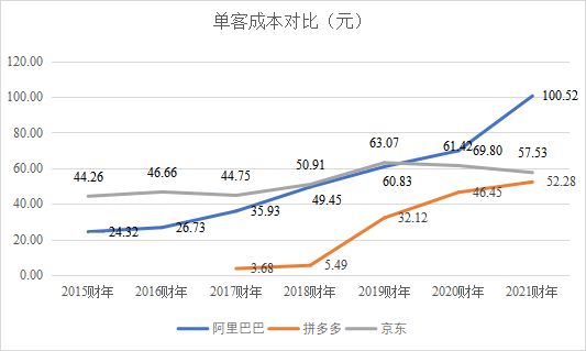 图1:阿里、拼多多、京东单客成本分析