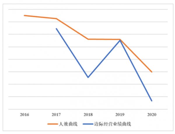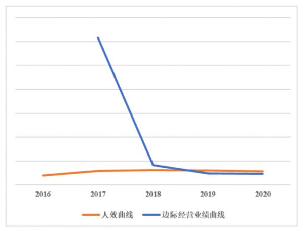 可以说,相对传统人效指标,这个指标更灵敏地指示了人效的变化趋势,而人效又与财效有同向变动的关系,这显然强烈预示了企业未来的财务表现。如图3,腾讯和阿里的边际经营业绩(以人为口径)曲线都呈现下降趋势,且处于人均GMV或人均营收曲线下方,其拖低了人效的趋势明显。