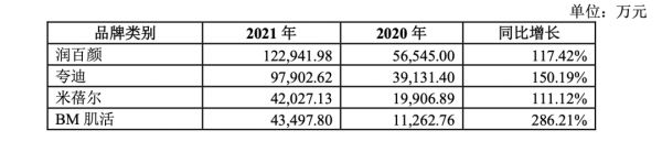 据财报数据显示,润百颜2021年营收12.29亿,首次突破单品牌超10亿元大关,同比增长117.42%;夸迪去年实现营收9.79亿,同比增长150.19%;米蓓尔营收4.2亿,占总营收的8.5%;BM肌活营收4.35亿元,同比增长286.21%,占总营收的8.8%。