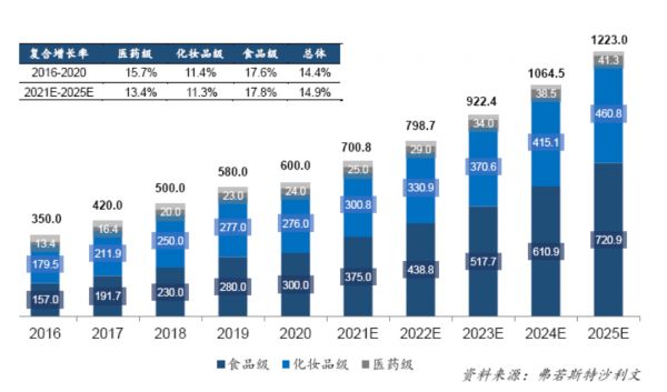 据弗若斯特沙利文研究报告显示,2020年全球玻尿酸原料市场销量达600吨,2016年-2020年复合增长率为14.4%。预计未来五年,全球玻尿酸原料市场将保持14.9%的复合增长率,在2025年销量可增至1223吨。